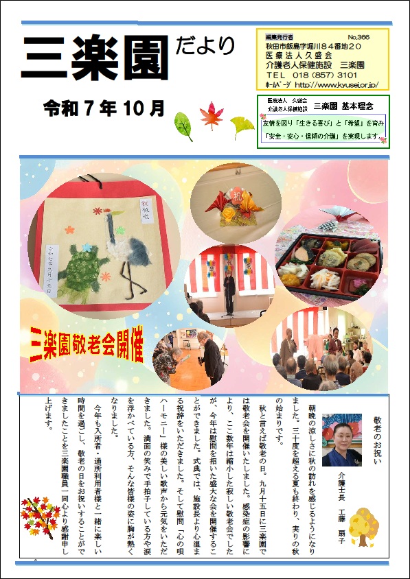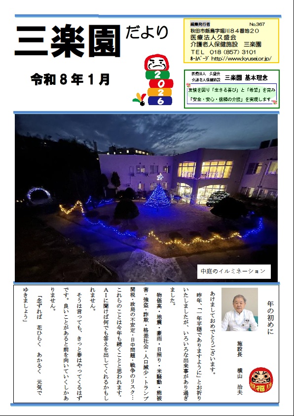 三楽園では、「三楽園だより」を毎月発行しております。内容は、三楽園の行事のご案内や開催報告を掲載しております。 こちらでは三楽園だよりをダウンロードいただけますので、どうぞご利用ください。 また、ご来園の際は、三楽園1階受付横に置いていますので、お手に取ってご覧いただければ幸いです。